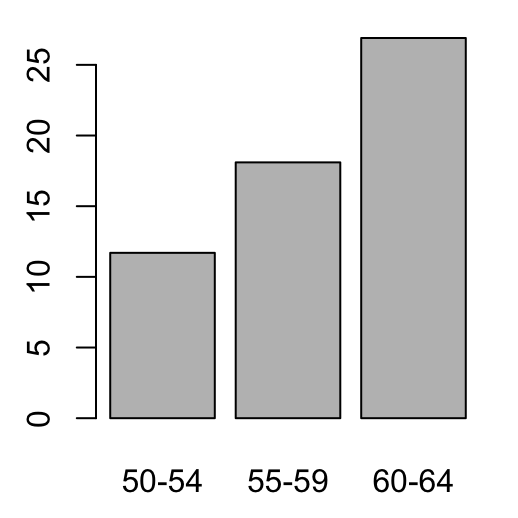 # Change axis titles # Change color (col = "gray") and remove frame barplot(x, main = "Death Rates in Virginia", xlab = "Age", ylab = "Rate")
